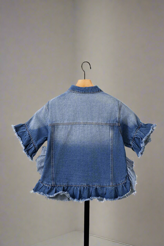 Ruffled Raw Hem Half Sleeve Denim Jacket